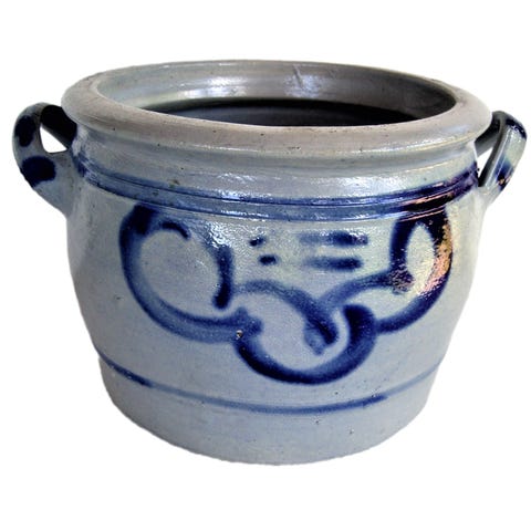 Keramik krukke med hank i blågrå nuancer. Krukken er rund med to sidehåndtag og dekoreret med blå bemaling langs siden. Egnet som opbevaringskrukke eller som urtepotteskjuler/pynt i hjem eller have. Stor.