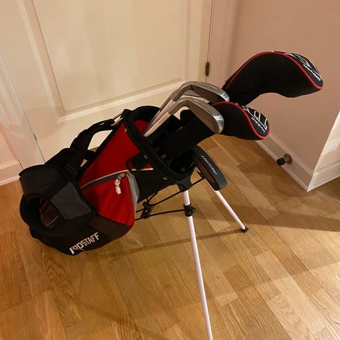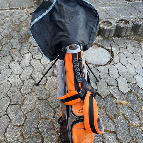 Putter, 2 jern, 2 fairway køller, driver, bag og vogn plus lidt andet