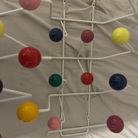 Ray Eames hang it all knagerække i hvidt metal med farvede kugleformede knopper i forskellige størrelser