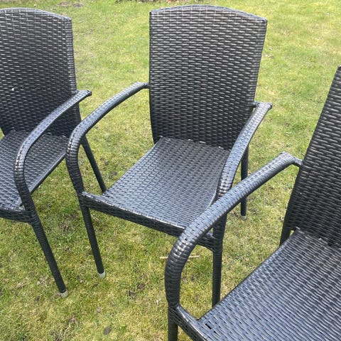 Sæt med to havestole i grå plastflet. Stolene har armlæn og højt ryglæn samt ben i metal med plastfødder. Velegnet til brug på terrasse, altan eller i have.