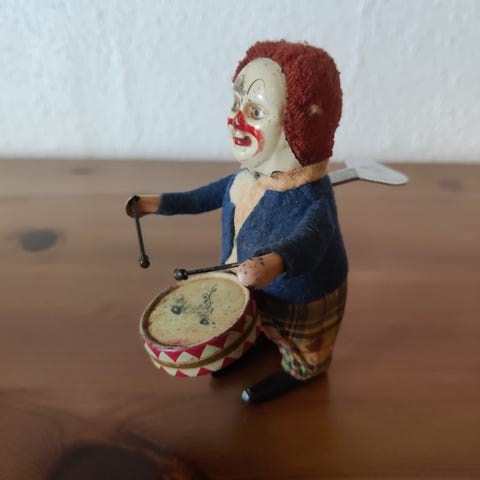Træ trommeslager som træklegetøj på hjul. Figuren forestiller en trommeslager i blå uniform med rød hat, placeret på en gul vogn med røde hjul. Foran figuren står en rød-hvid tromme, som trommeslageren slår på, når legetøjet trækkes af den røde snor. Legetøjet er udført i malet træ og egner sig som klassisk træklegetøj eller som dekoration på børneværelset.
