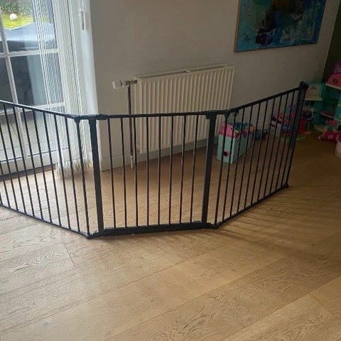 BabyDan sikkerhedsgitter i sort metal i modellen "Flex XXL". Gitteret består af 5 sektioner, der kan samles til en indhegning omkring f.eks. legeområde, brændeovn eller andre områder i hjemmet. En af sektionerne fungerer som låge med åbne-/lukkemekanisme.