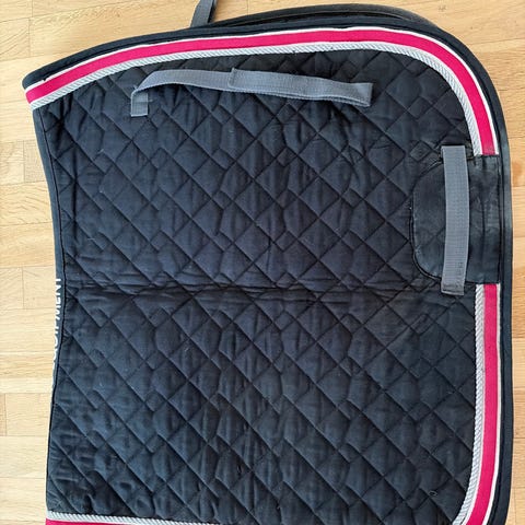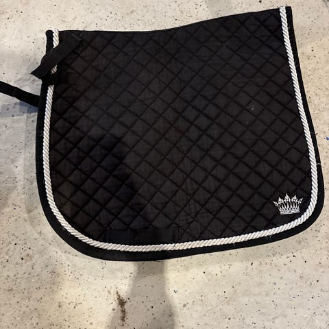 Rideunderlag i hvid farve med kviltet mønster. Underlaget har kant med tvundet snor og lille kronebroderi i det ene hjørne. Det er formet til dressursadel og har stropper til fastgørelse ved sadel og gjord. Egnet til brug under sadel for at give hesten komfort og beskytte sadlen mod sved og snavs.
