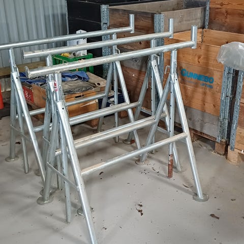 Stativ til stillads i metal. Velegnet som understøtning til stilladssystemer eller midlertidige konstruktioner. Fremstillet i metal med trekantede ben og tværgående rør, som giver mulighed for at bære planker eller andre elementer. Kan bruges på byggepladser, ved renoveringsopgaver eller andre steder, hvor der er behov for midlertidig understøtning eller afskærmning.