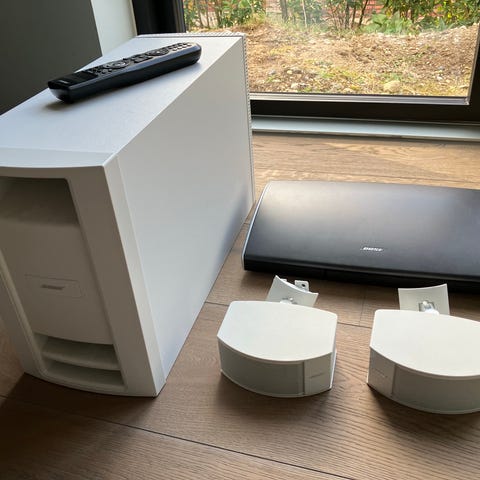Bose Lifestyle 235 hjemmebiograf system i hvid. Systemet består af en hovedenhed/mediecenter, subwoofer og kompakte højttalere.