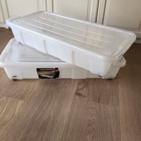 Opbevaringskassen i plast med 6 hjul og foldbar låg. Boksen egnet til opbevaring under seng eller andre lave møbler.