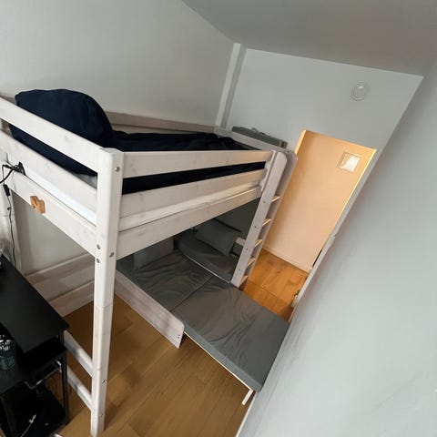 Jeg har desværre ikke et billede af den samlet. Der følger også to flexa madrasser med og ekstra sengehest til nederste køje.