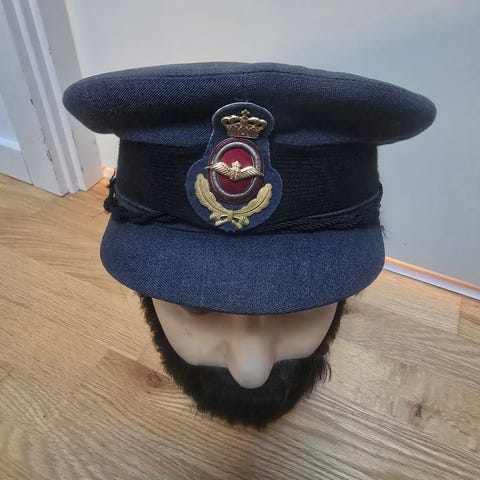 Danacap pilotkasket i størrelse 57 med tilhørende emblemer. Kasketten har klassisk pilotdesign med skygge og dekorativ snor foran. Indvendigt er der foret inderdel med Danacap-logo. Medfølgende metalemblemer i guldlook omfatter vingesymbol og rundt mærke med skjoldmotiv, beregnet til montering på kasketten via beslag på bagsiden. Velegnet som uniformsdel, samlerobjekt eller til udklædning, hvor der ønskes et pilotinspireret udtryk.