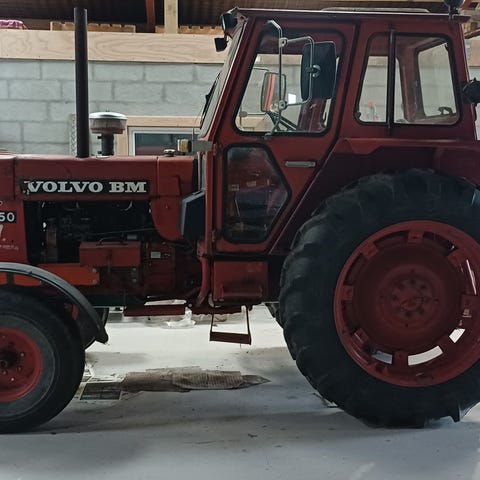 Traktor med førerhus, frontlæsser og bagmonteret graveraggregat. Maskinen er gul og udstyret med store traktordæk, hydrauliksystem og arbejdslys på taget. Frontlæsseren har skovl, og bagtil er der monteret gravearm med hydrauliske cylindre. Egnet til jord- og entreprenørarbejde, f.eks. flytning af jord, grus og andre materialer samt mindre graveopgaver på mark eller byggeplads.