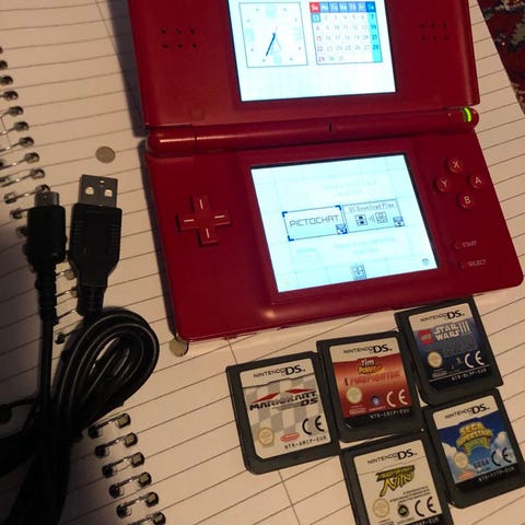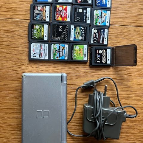 Nintendo DS-pakke til samlere/fixere! Sort DS (virker, men hængsel hænger – oplader + etui inkl.). Med Spectrobes DS (ægte), 2x multicarts (100+ spil hver, kopi), fake SoulSilver (købt ved en fejl over Ebay engang).