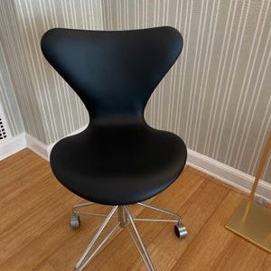 Fritz Hansen kontorstol designet af Arne Jacobsen. Stolen har formspændt sæde og ryg i sort overflade samt understel i metal med hjul. Velegnet som kontor- eller arbejdsstol ved skrivebord. Klassisk Arne Jacobsen-formgivning med drejefunktion og manuel højdejustering via løftestang under sædet.