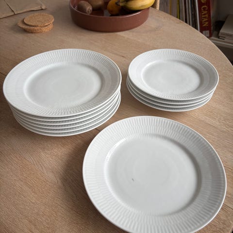 Royal Copenhagen tallerkener, kopper og underkopper i hvidt porcelæn. Sættet omfatter flade tallerkener, dybe/skåleformede tallerkener, kopper samt underkopper til kopper. Enkel, hvidt stel med let rillet kant. Velegnet som hverdagstel eller som supplement til eksisterende Royal Copenhagen stel.