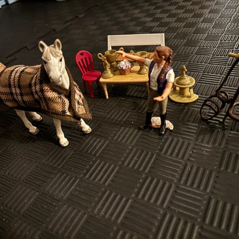 Schleich hesteshow legesæt med figurer og tilbehør. Det indeholder blandt andet et show område med rød løber og et hvidt telt hvor rytteren kan gøre sig klar. Alt tilbehør kan ses på de vedlagte billeder.