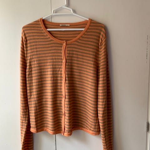 Cardigan Nue notes, stribet rust/blå, 100% ekstrafine merino wool. Ubrugt. Overvidde 82 cm. Længde55,5 cm. Ærmelængde 60 cm.