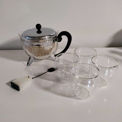 Glas tekande med integreret tefilter og blå plastlåg. Tefilteret er aftageligt og har små huller, der egner sig til brygning af løs te. Velegnet til tilberedning og servering af te i mindre portioner.