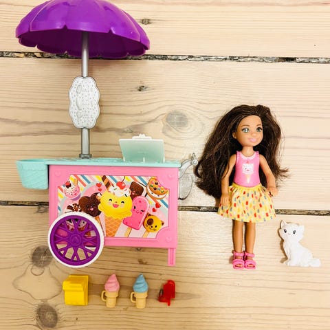 Barbie Chelsea skolesæt med Chelsea dukke, Komplet sæt pånær én bog. Indeholder Chelsea Barbie, Skole med tavle, skole-borde, saks, bog, lim og rygsæk + legeplads med gynge og rutschebane + kantine med bakker, juice, kasseapparat.