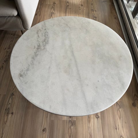 Fint og meget tungt marmor-sofabord sælges. Mål: 88x88 cm. Der er nogle rander efter glas, som ikke er forsøgt fjernet. Har prøvet at ‘fange’ det på fotos, men ikke helt nemt.