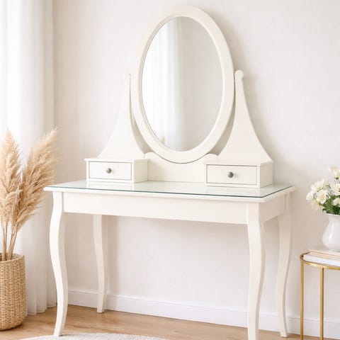 Fint sminkebord til den tidlige teenager, det har mange gode timer i sig endnu - de "pletter" man kan se på bordpladen kan ikke fjernes, da det er noget olie fra neglelaksfjerner.
