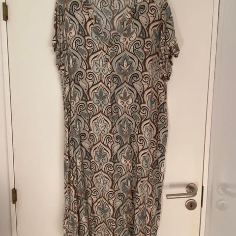 Soyaconcept hverdagskjole i str. L. Lang kjole i multifarvet mønster med nuancer af blandt andet blå, rosa, sort og camel. Kjolen er fremstillet i viskose og har lange ærmer samt v-udskæring. Velegnet som hverdagskjole. Er du høj så er den ogsåflot åbenstående som jakke til bukser.