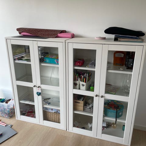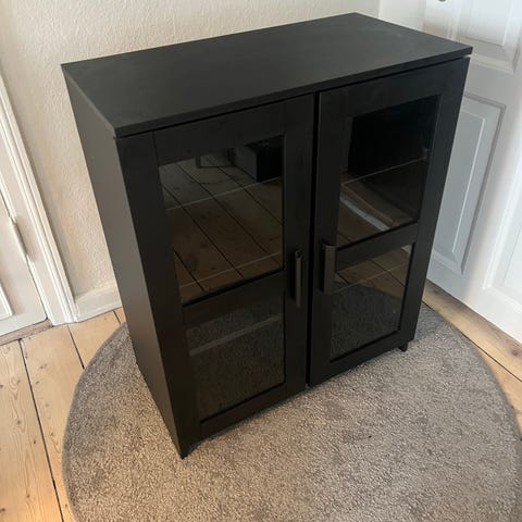 IKEA skab med glaslåger. Skabet har to øverste låger med glasindsats og hylder bagved, Nederst er der lukkede opbevaringsrum, ridse på fronten i højre låge
