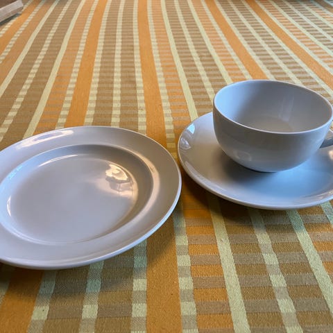 Har også 4 stk middags tallerkener 24 cm og 1 sæt salt og peber.