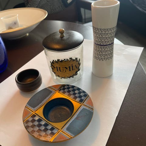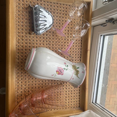 Diverse køkken- og pyntegenstande i porcelæn og glas. Blandingen omfatter blandt andet tallerkener, skåle, krus, kander, lysestager, skåle og små dekorative figurer. Flere dele er i mønstret og farvet porcelæn, andre i klart eller farvet glas. Velegnet som hverdagsservice, reservedele til stel eller som pynt og dekoration i hjemmet. Sælges samlet som på billederne.