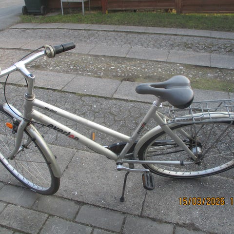 med fine dæk, 7 indvendige gear, fastmonteret købeskurv for, bagagebeger, ringeklokke, refleksser for bag og på hjul kører som den skal.
