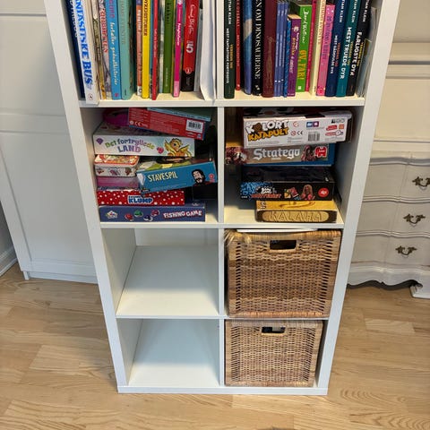 Hvid IKEA Kallax reol med 4 x 4 rum. Enkelte synlige brugsspor, men generelt i pæn stand.