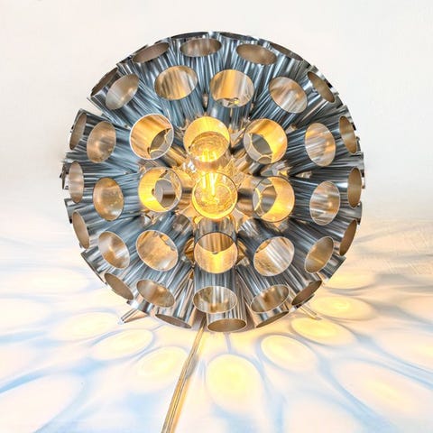 Lampen er formet som en kugle, konstrueret af svejsede aluminiumsrør, hvilket skaber et futuristisk og atomart udseende.