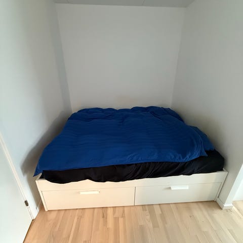 IKEA BRIMNES seng. Der er masser af opbevaringsplads skjult under sengen i 4 store skuffer. Perfekt til opbevaring af dyner, puder og sengetøj.