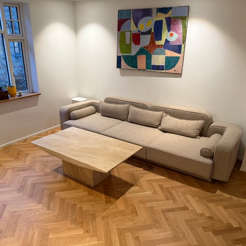 Sofaen er brugt, men i god stand. Hynderne er lidt bløde, men man sidder stadig godt i sofaen.