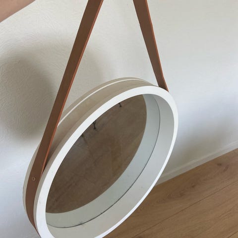 Væghængt spejl med læderhank sælges. 40 cm i diameter.