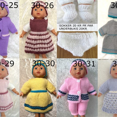 Nyt hjemmestrikket tøj til dukke på ca 30-35cm fx baby Rose.
