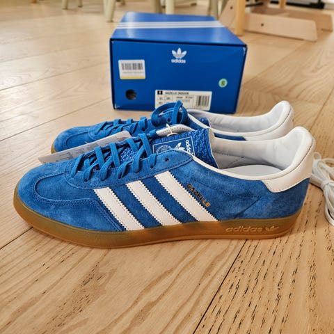 Adidas BC Trainer sneakers i størrelse 44. Modellen er lavet i blå ruskind med grønne detaljer, herunder de klassiske tre striber, snørebånd og hælkappe. Ydersålen er i lys gummi. Skoene er velegnede som hverdagssko eller fritidssko. Unisex-model der kan bruges af både mænd og kvinder, afhængigt af pasform og størrelse.