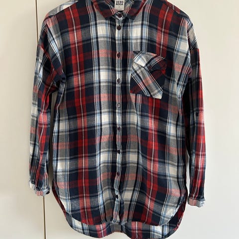 Vero Moda skjorte til damer i størrelse XS. Skjorten er i ternet mønster med nuancer af rød, blå og hvid. Klassisk skjortemodel med knaplukning foran, krave og brystlomme. Lange ærmer med afrundet kant forneden.