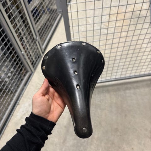 Brooks cykelsadel i sort læder, damemodel B17S. Sadel med klassisk Brooks-logo præget i læderet og nitter langs kanten. Undersiden har metalskinner til montering på sadelpind.