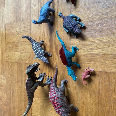Diverse mellemstore dinosaurer (ikke Schleich) og små dinosauer (byttedyr) samt en dino “borg”.