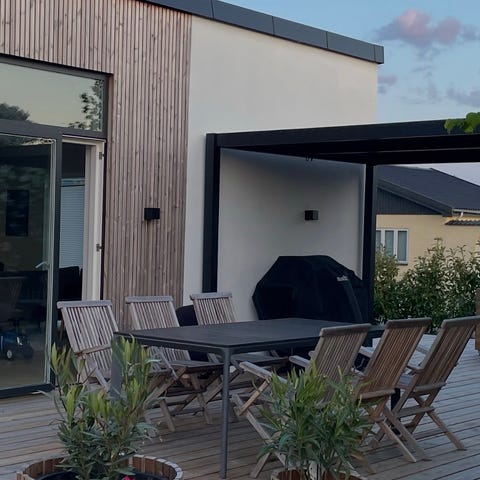 To stole, hynder og tilhørende parasol medfølger.