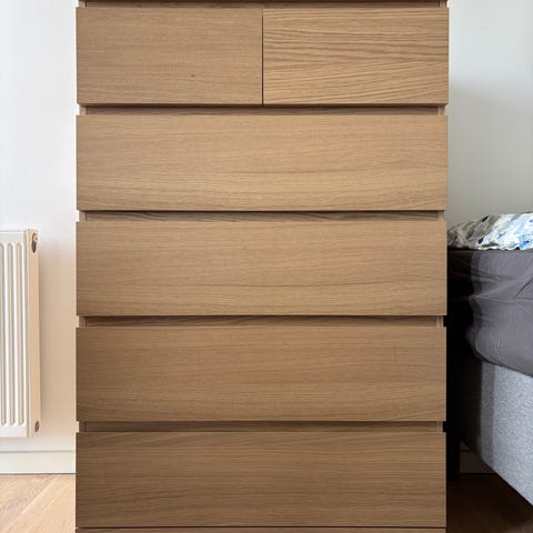 Et stykke mangler imellem de to øverste skuffer på højre side.