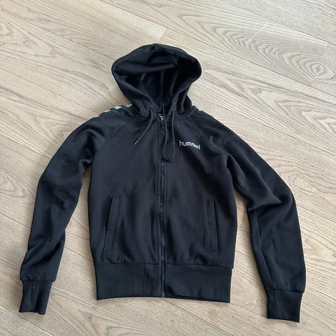 gråmeleret Jersey bluse med sort v-hals og skulder med de kendte striber. Super behageligt materiale, god kvalitet. Mrk.: Hummel Women 100% Polyester. Str. S. Blusens Brystmål 88 cm