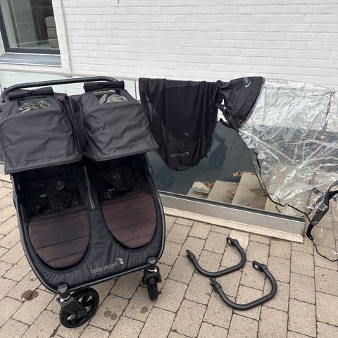 Baby Jogger tvillingekombivogn med to side-by-side sæder i beige nuance. Vognen har individuelle kalecher, fempunktssele i hvert sæde og opbevaringskurv under sæderne. Medfølgende to matchende liggedele i mørk farve, der kan bruges til spædbørn. Egnet til transport af tvillinger eller to børn med nogenlunde samme alder.