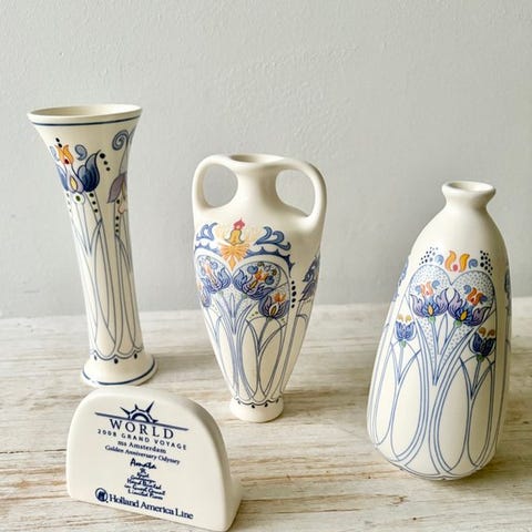 Krukkerne og vaserne er udsmykket med smukke blomstermotiver.