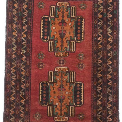 Baluch Afghan-model, oprindelse Pakistan; tæppe med uld pile på bomuldsgundlagd, 151 × 91 cm, håndknyttet, 21. århundrede, professionelt rengjort og i meget god stand. Klik på den blå "gå til varen" knap, for at købe eller byde på denne vare. Den samlede pris vil blive vist inden du afgiver dit bud.