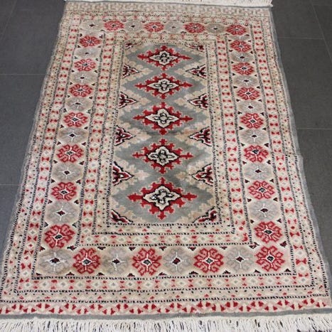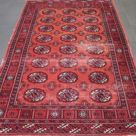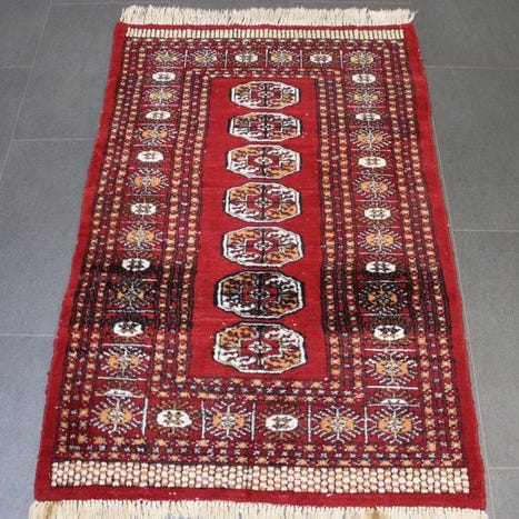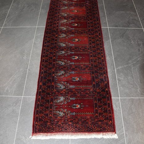 Oprindelsesland: Pakistan; Model: Buchara; Størrelse: 187 × 63 cm; Materiale: uld på bomuld; Håndlavet håndknyttet tæppe fra slutningen af det 20. århundrede (1980–1990); Farver: rød og grå; Tilstand: generelt god stand med brugsspor. Klik på den blå "gå til varen" knap, for at købe eller byde på denne vare. Den samlede pris vil blive vist inden du afgiver dit bud.