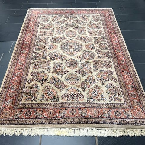 Tæppet præsenterer et traditionelt floralt geometrisk mønster med forskellige blomsterinspirerede motiver gennemprøvede mønstre.