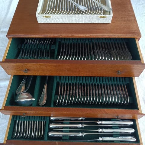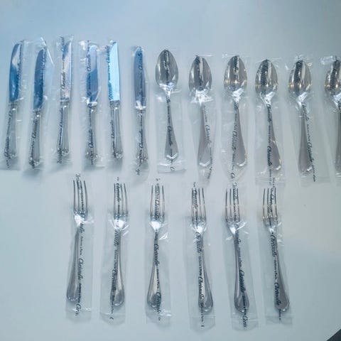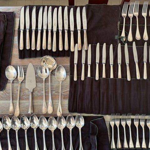 Christofle bestiksæt model Rubans på 120 dele plus 8 serveringsbestik i sølvplet købt mellem 1920 og 1940 i fremragende stand. Meget lidt brugt.
