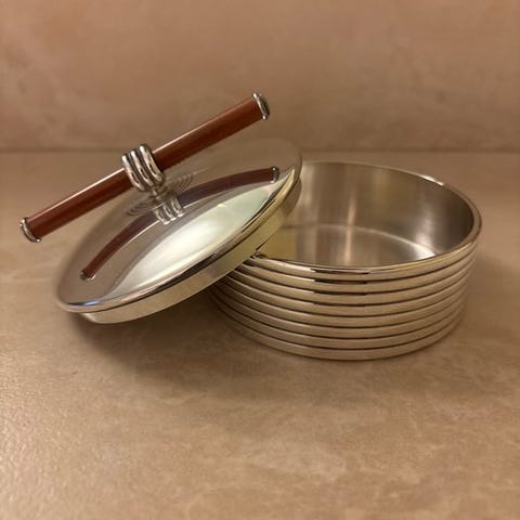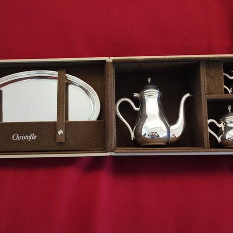Servicebakker i sølvbelagt metal fremstillet af det prestigefyldte luksus-sølvvarehus Christofle i anden halvdel af det tyvende århundrede.