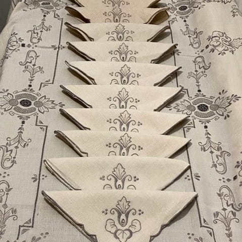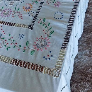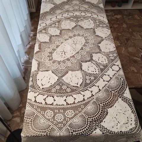 Gennemsigtigheden i stoffet kræver et underliggende dækkende stykke, som kan være hvidt eller i andre farver, så bordet får et nyt udseende hver gang. (se foto med rosa lakrøs baggrund, oker gul, grønntone og sandfarve)