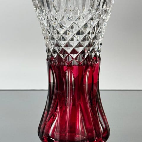 Val Saint Lambert krystalvase, Belgien, cirka 1950–1960, fuchsia-gennemsigtig, underskrevet på bunden, målene H 19 cm, B 14 cm, D 19 cm, i fremragende stand med kun mindre slidmærker. Klik på den blå "gå til varen" knap, for at købe eller byde på denne vare. Den samlede pris vil blive vist inden du afgiver dit bud.