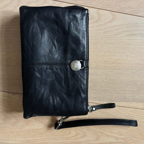Clutch, Adax, skind, Ny, let og fix clutch i sort skind med aftagelig skulderrem, udvendig lynlås lomme, 3 store indvendige rum, indvendigt lynlås rum, 6 kort rum og et lille rum i siden. Aldrig brugt.